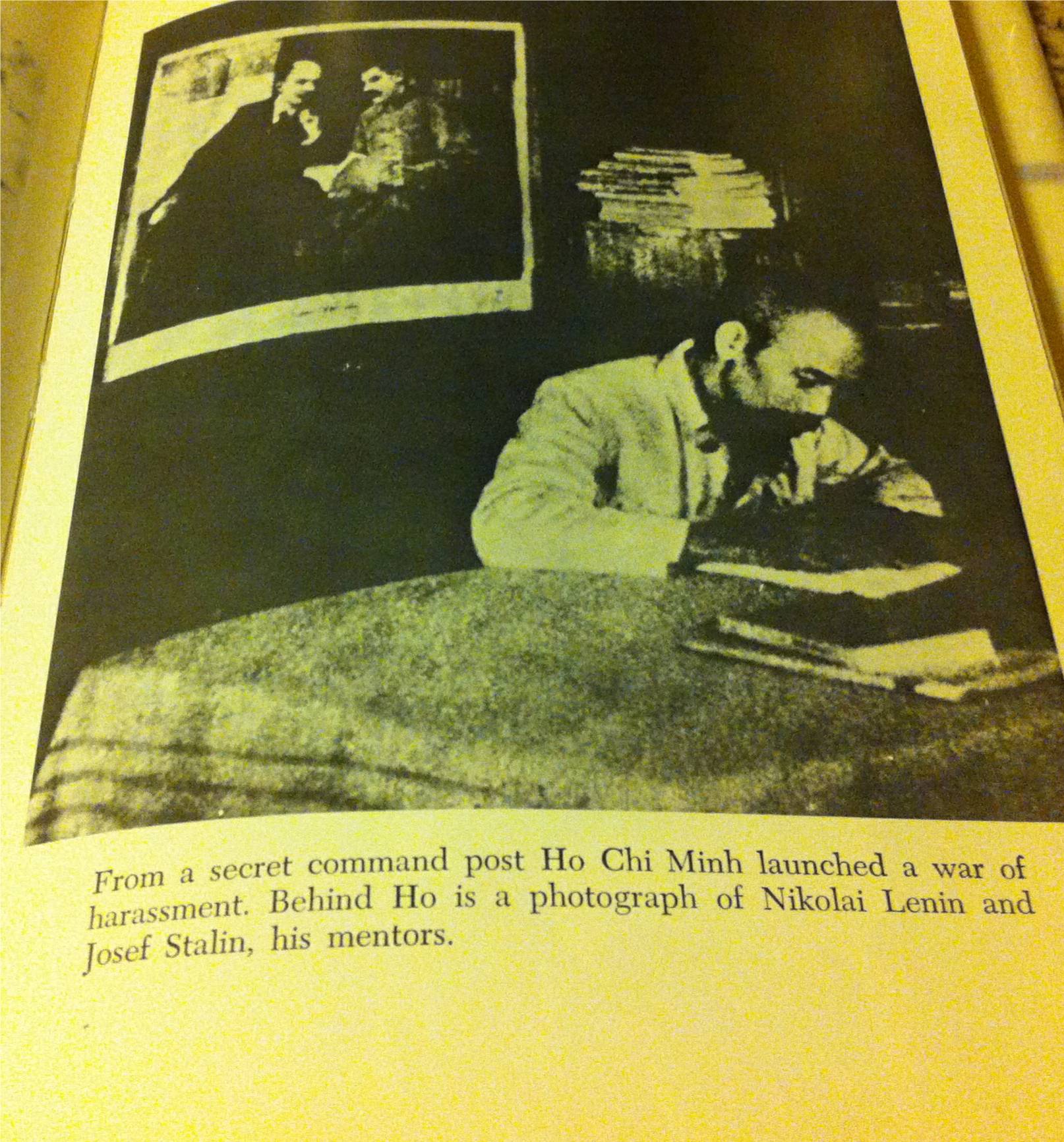Ho Chi Minh and his Vietnam, 1972, Sainteny. Từ một mệnh lệnh trụ cột bí mật, Hồ Chí Minh phóng ra cuộc chiến đầy thống khổ. Bên cạnh Hồ là hình ảnh của Nikolai Lenin và Josef Stalin, những ông thầy của Hồ.
