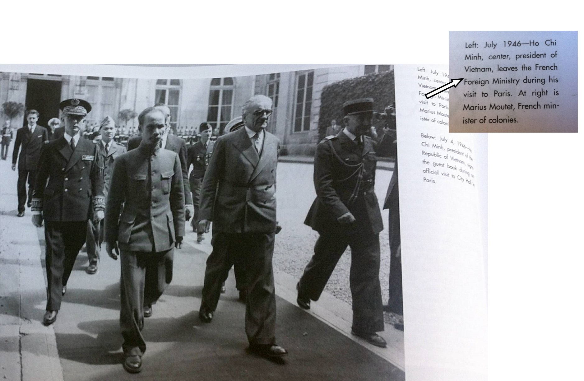 Vietnam A Complete Photographic History, Michael Maclear and Hal Buell, 2003. Sau khi được Jean Sainteny hộ tống tới Paris, HCM được phái đoàn phe thiên tả ra đón rước. Bên cạnh Hồ là ông Marius Moutet (tóc trắng) thuộc Đảng Xã Hội thân cộng, người bạn gắn liền với HCM trong gian đoạn 4 tháng bên Pháp.