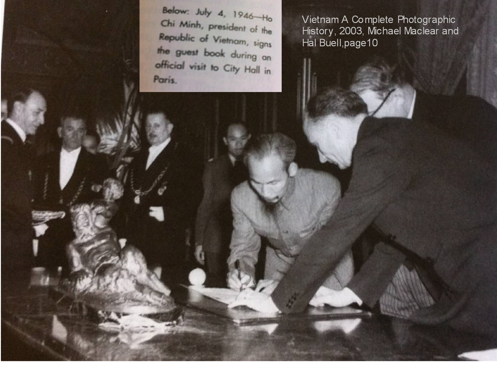 Vietnam A Complete Photographic History. HCM ký vào sổ lưu niệm (guest book) chung với các quan khách thăm viếng Tòa Thị Chánh Paris, ngày 4/7/1946.