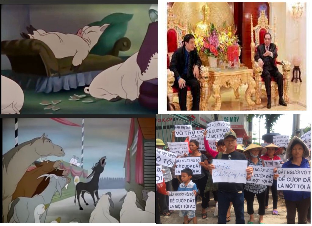 Đám thú nghèo hèn thiếu ăn kéo nhau la ó trước nhà Napoleon kêu gào được công bằng. Hình bên tương ứng dân oan nhiều chục năm đi biểu tình đòi lại nhà đất bị Đảng cướp. Họ sống vất vưởng không nơi nương tựa.