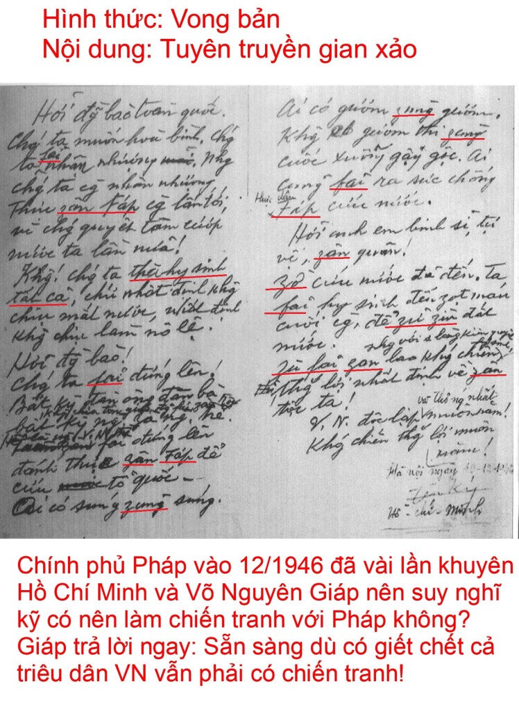 Khi biết Pháp tái chiếm để đánh cộng sản ra khỏi Đông Dương thì Hồ lại lường gạt dân qua lá thư kêu gọi “toàn quốc kháng chiến”, cho rằng “thực zân Pháp chúng quyết tâm cướp nước ta lần nữa”. Như video trên là bằng chứng, Pháp rất muốn HCM rời bỏ hàng ngũ cộng sản để Pháp không cần tái chiếm, thế nhưng với giọng điệu cứng rắn của ông Giáp, theo lệnh HCM, không chút lưỡng lự trả lời ngay rằng sẵn sàng làm ra chiến tranh dù một triệu dân Việt phải bỏ mạng. Vậy cho thấy chính HCM làm ra cuộc chiến theo chỉ huy của đàn anh Liên Sô và Trung Cộng. Cuộc chiến bắt đầu từ 19/12/1946 kéo dài tới 30/4/1975 là cuộc chiến tranh ý thức hệ đã làm hằng triệu người bỏ mạng vì tham vọng điên cuồng của tên đầu sỏ HCM.